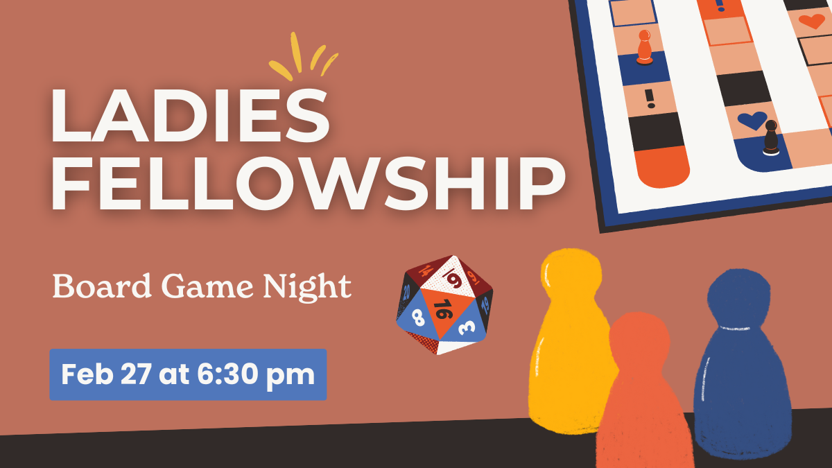 Ladies, come enjoy Christian fellowship and food at our game night! Bring a lost friend. We will have a couple of ladies sharing their salvation testimonies.